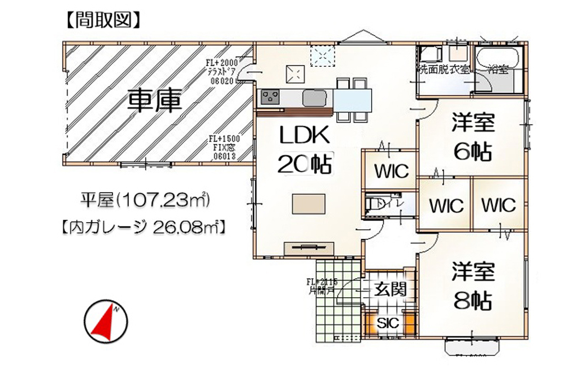 | 建物面積 | 107.23㎡(32.37坪)※内ガレージ26.08㎡(7.87坪) |