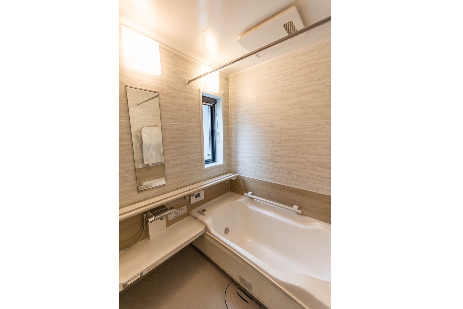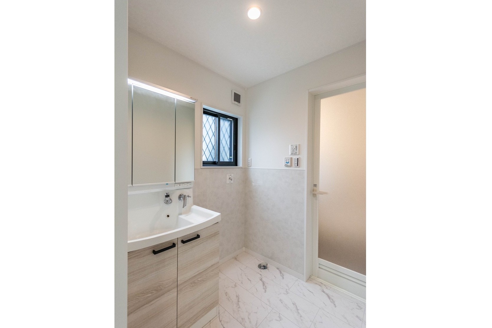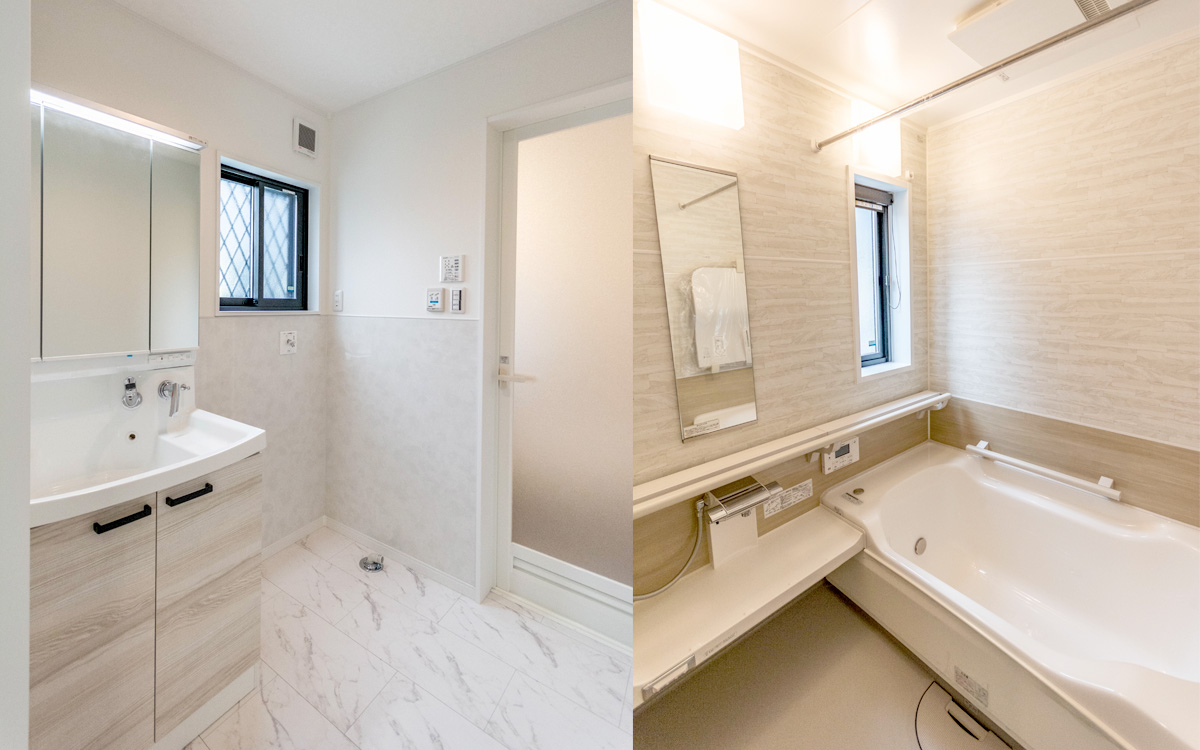 【洗面所&浴室】浴室は換気、乾燥、暖房機能付き。断熱性能が高く、浴室内の温度低下を最小限に抑えるため、いつでも暖かく入浴することができます。鏡裏に収納がある洗面化粧台付きです。