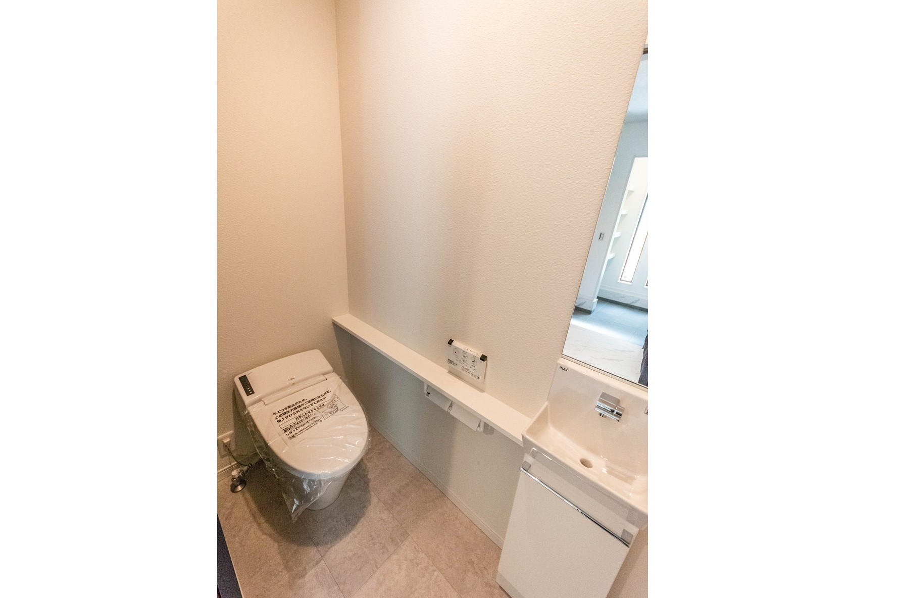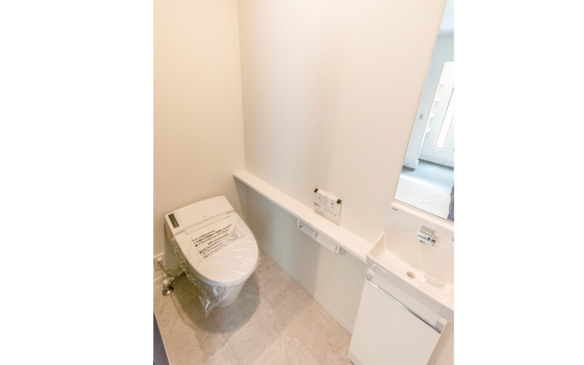 【トイレ】スタイリッシュなタンクレストイレはウォシュレット付きです。収納付きの手洗い器も完備。