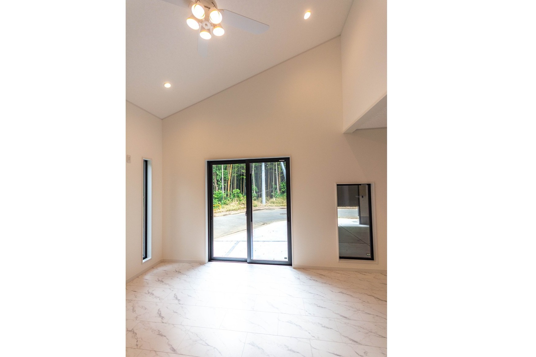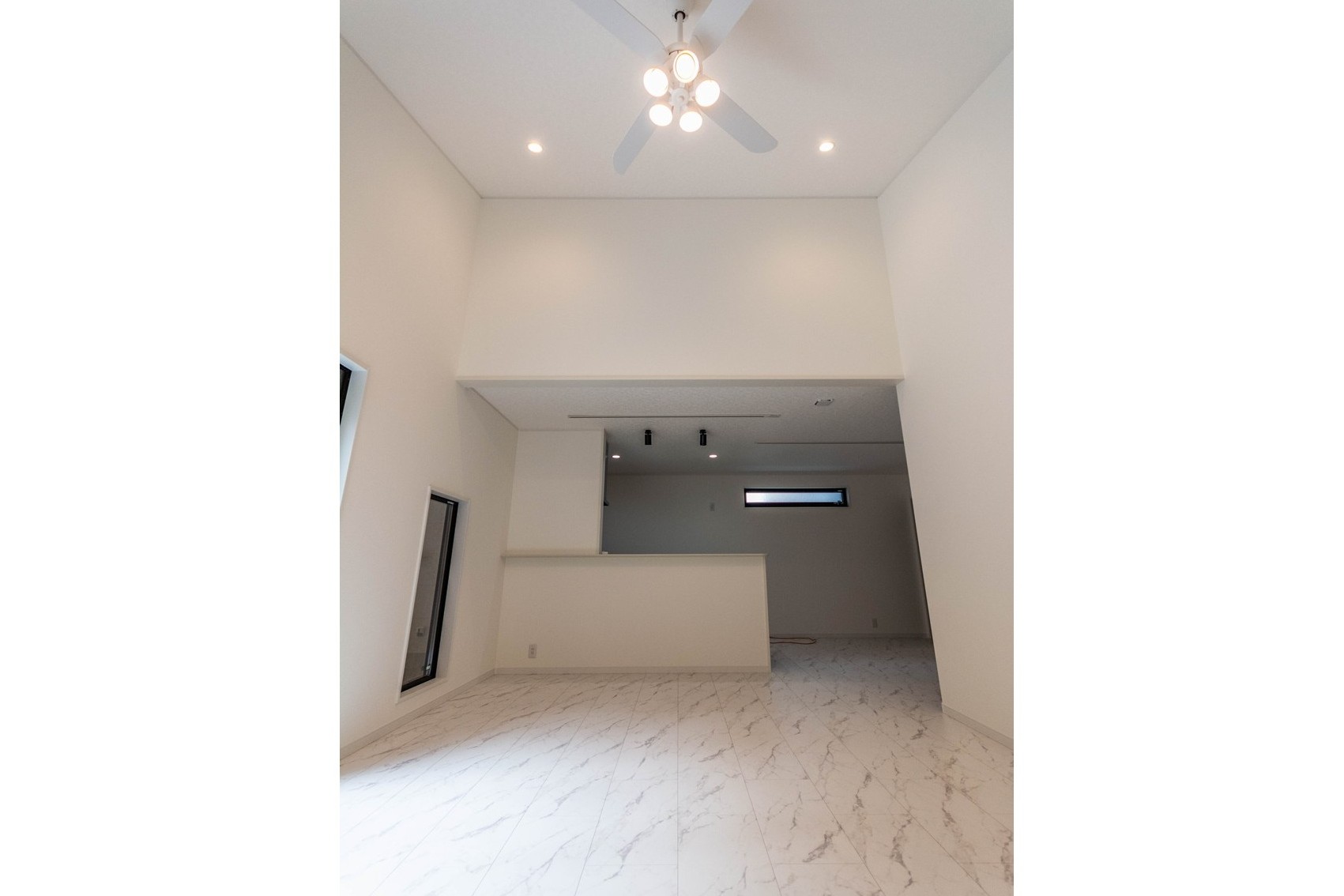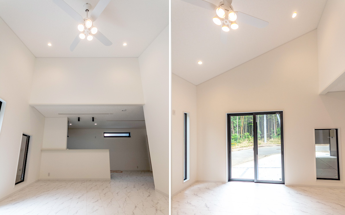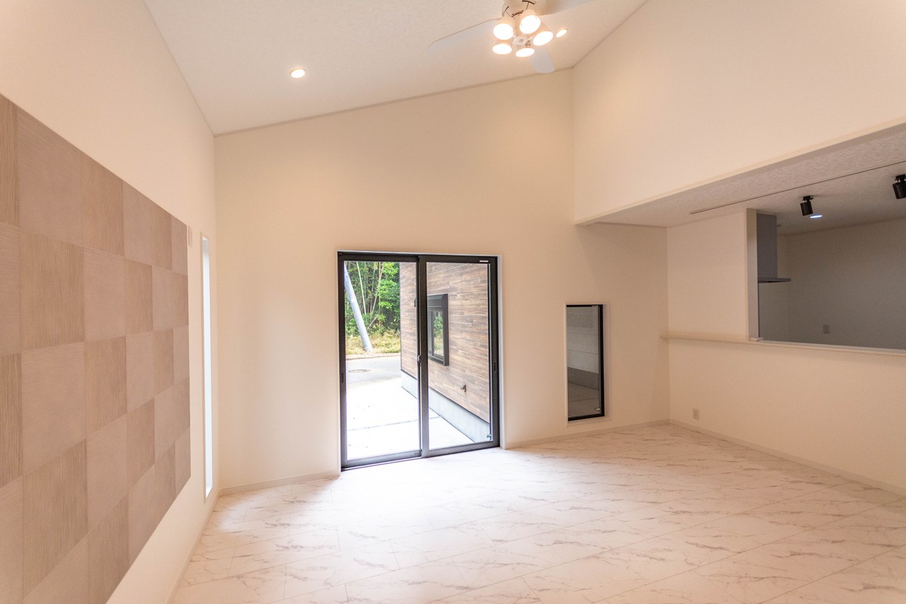 【リビング】シーリングファンライトが設置されて明るく開放的なリビング。キッチンからリビング全体が見渡せます。