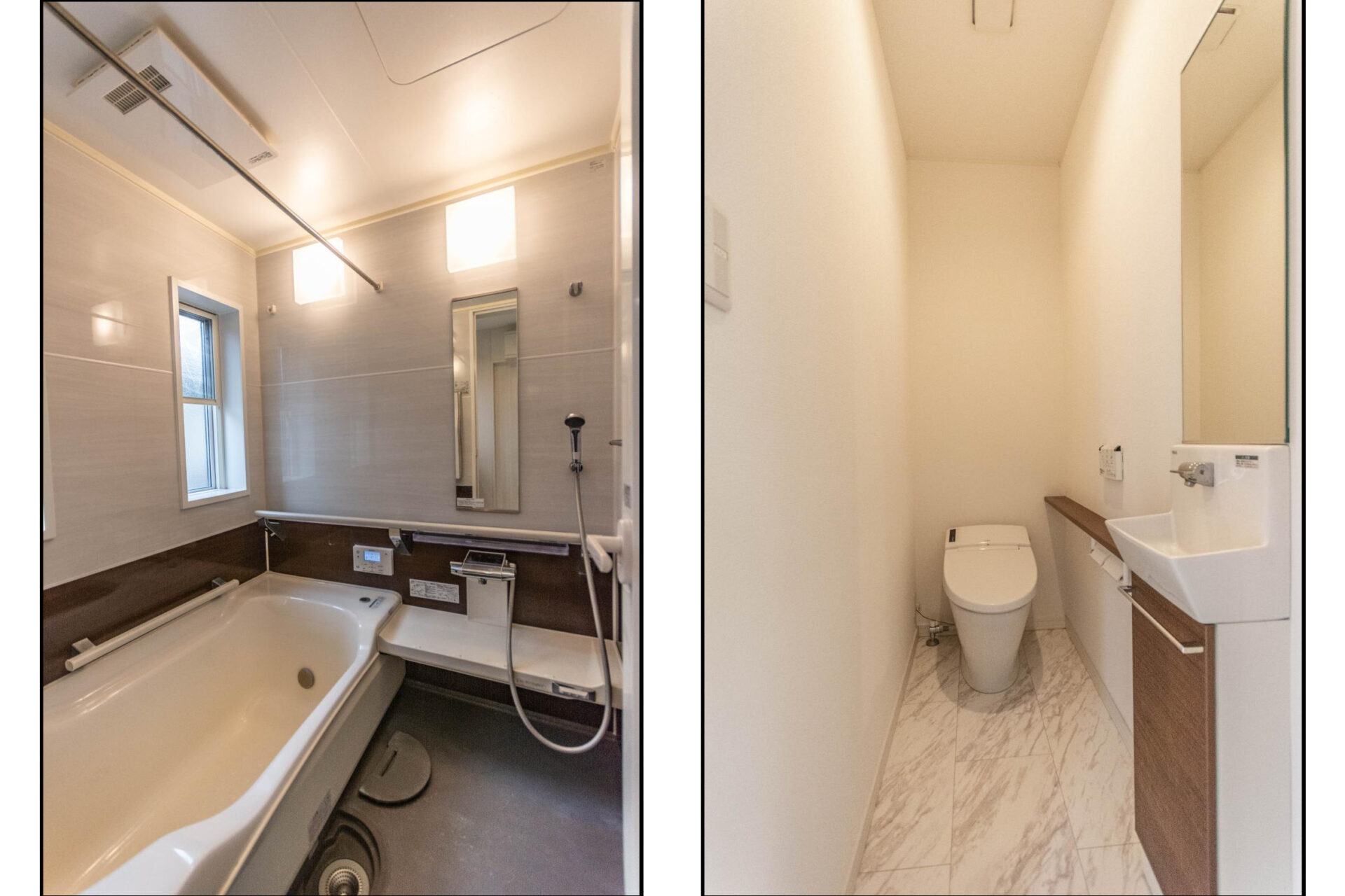 【浴室・トイレ】ユニットバスは換気乾燥暖房付き!室内に物干し棒もあり雨の日のお洗濯も安心です!浴槽はお湯が冷めにくい、浴槽保温材と保湿組フタのダブル保温構造。スタイリッシュなタンクレストイレはウォシュレット付きです!収納付きの手洗い器も完備!