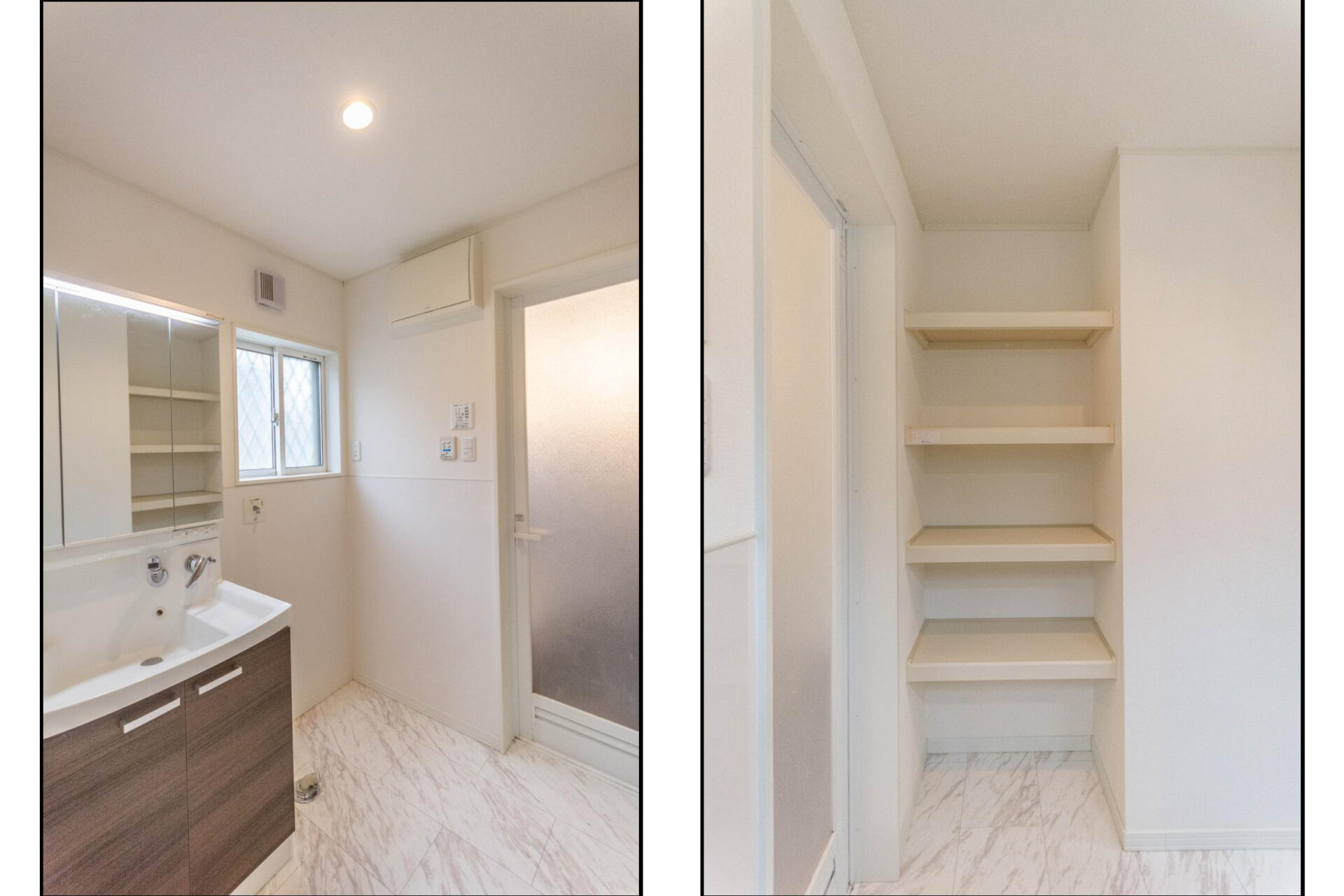 【洗面脱衣室】3面鏡付きのシャワー付き洗面台です。ミラー裏にはたっぷりの収納スペースがあり水回りの小物をスッキリ整理することができます!洗面脱衣室にある棚付きの収納はお風呂周りの備品を収納するのに便利です!