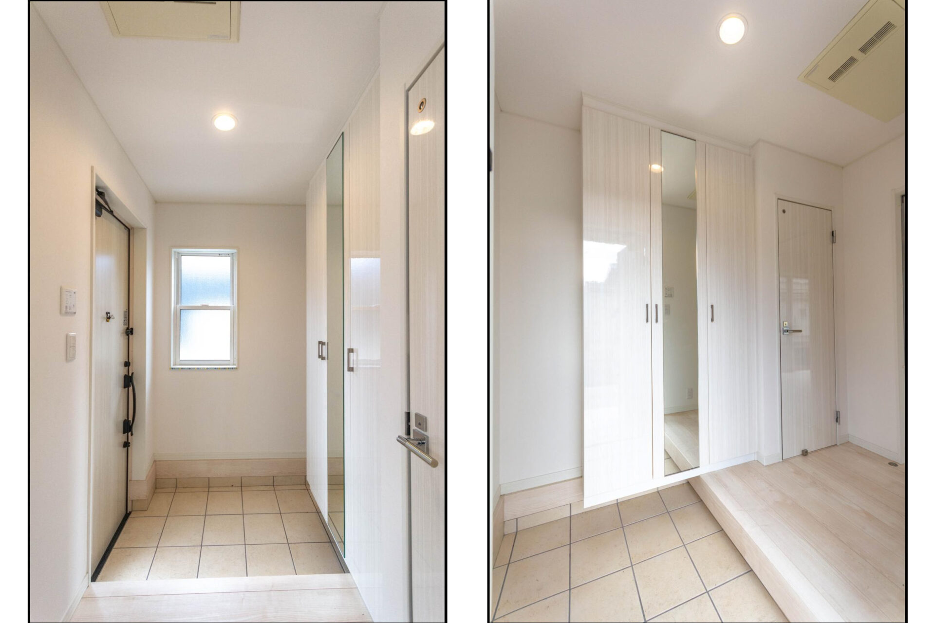 【玄関】玄関の下駄箱は便利な全身鏡付、上段まで棚を取り付けてあるので沢山の靴が収納できます。