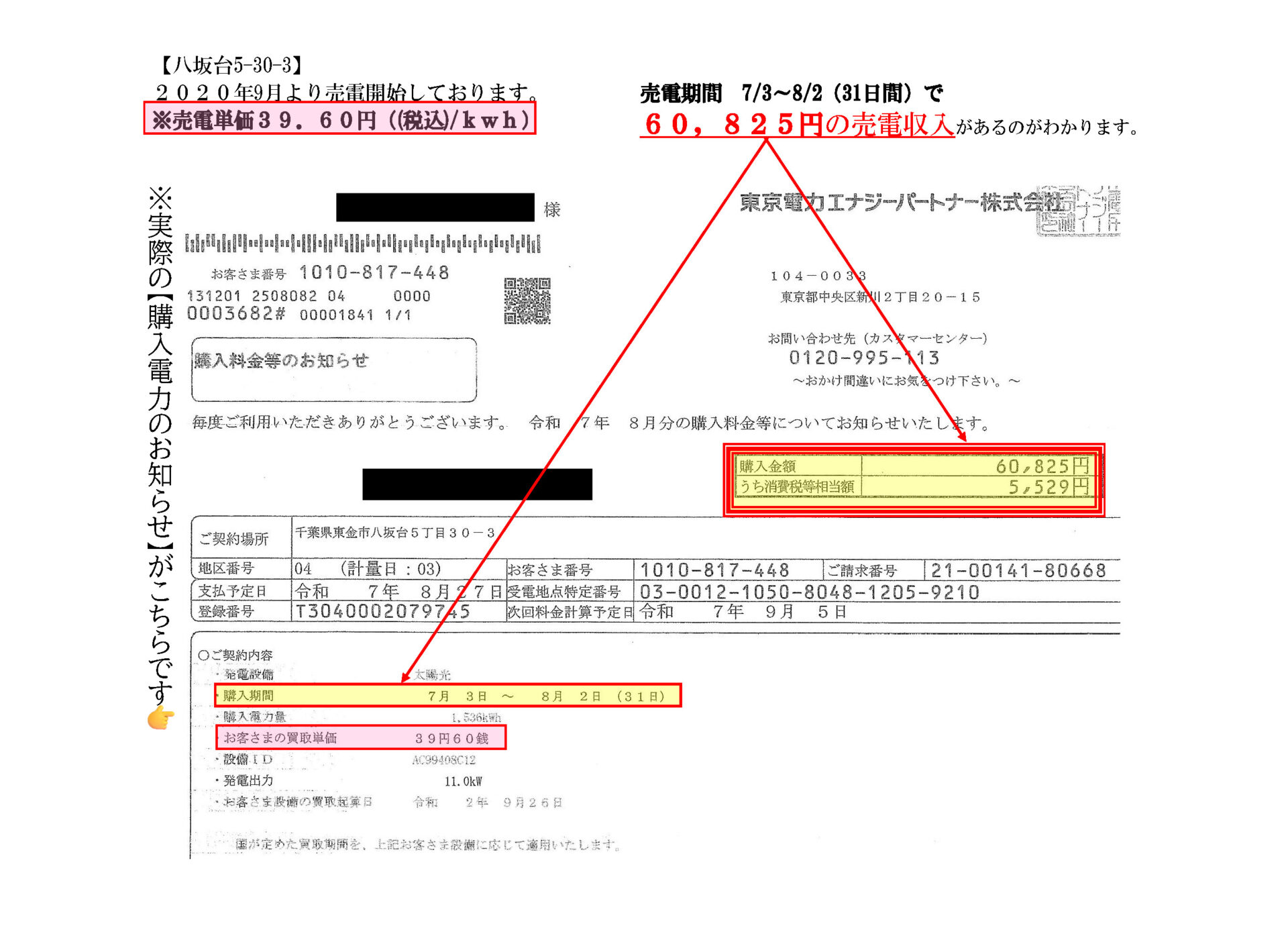 【実際の売電状況の例】令和7年7/3~8/2(31日間)で60,825円の売電収入があるのがわかります。